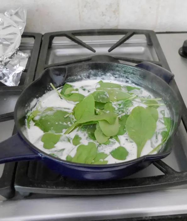 - Coloca las espinacas frescas en la salsa y cocina hasta que se marchiten (2-3 minutos).